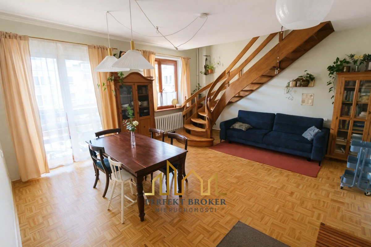 Mieszkanie jest bezczynszowe, słoneczne i zapewnia wygodny podział na strefę dzienną i prywatną. Na dolnym poziomie znajduje się przestronny salon z jadalnią i wyjściem na balkon, oddzielna kuchnia, łazienka oraz sypialnia. Górny poziom obejmuje trzy dodatkowe sypialnie oraz drugą łazienkę, a jedna z sypialni posiada wyjście na drugi balkon.